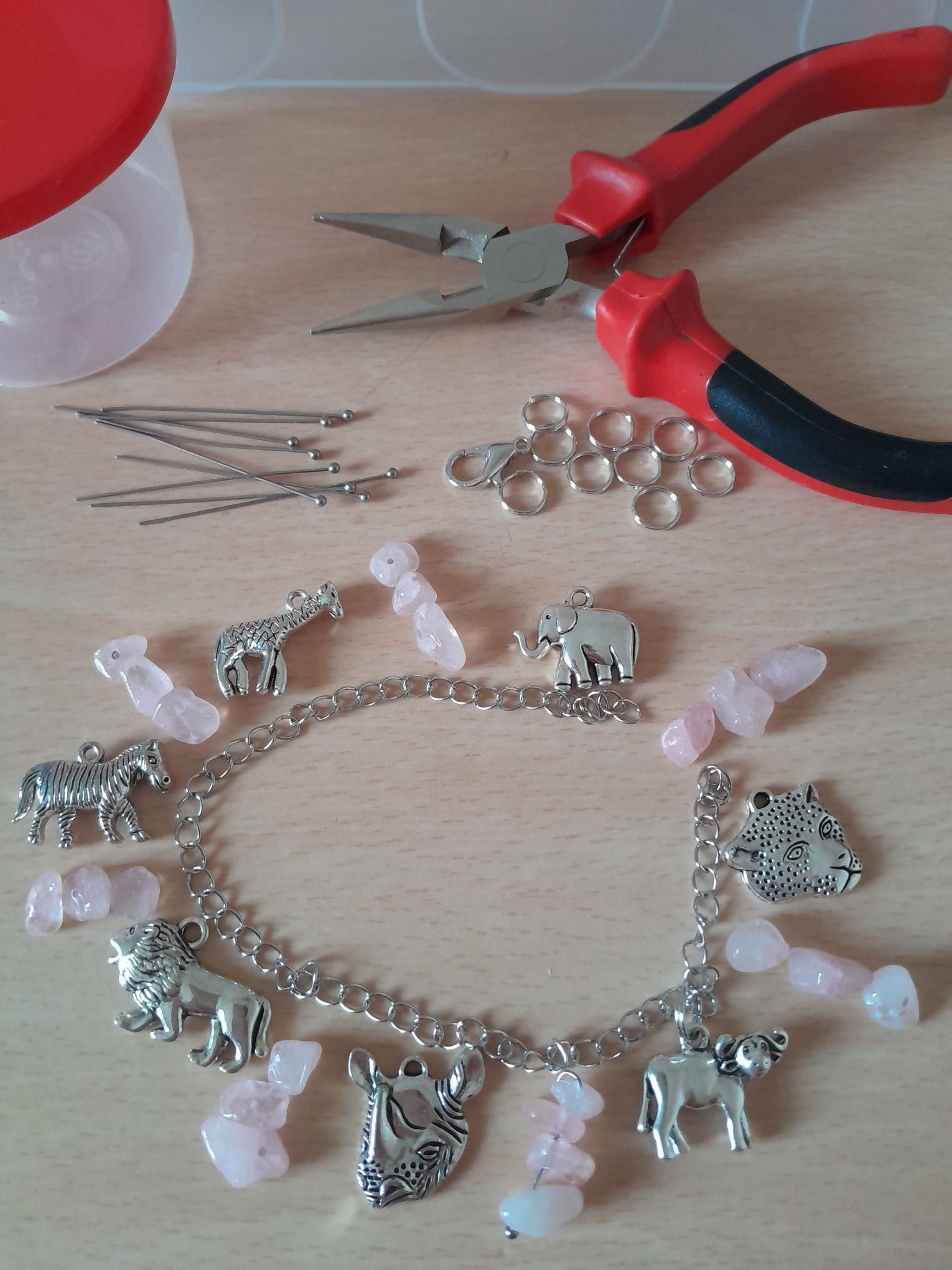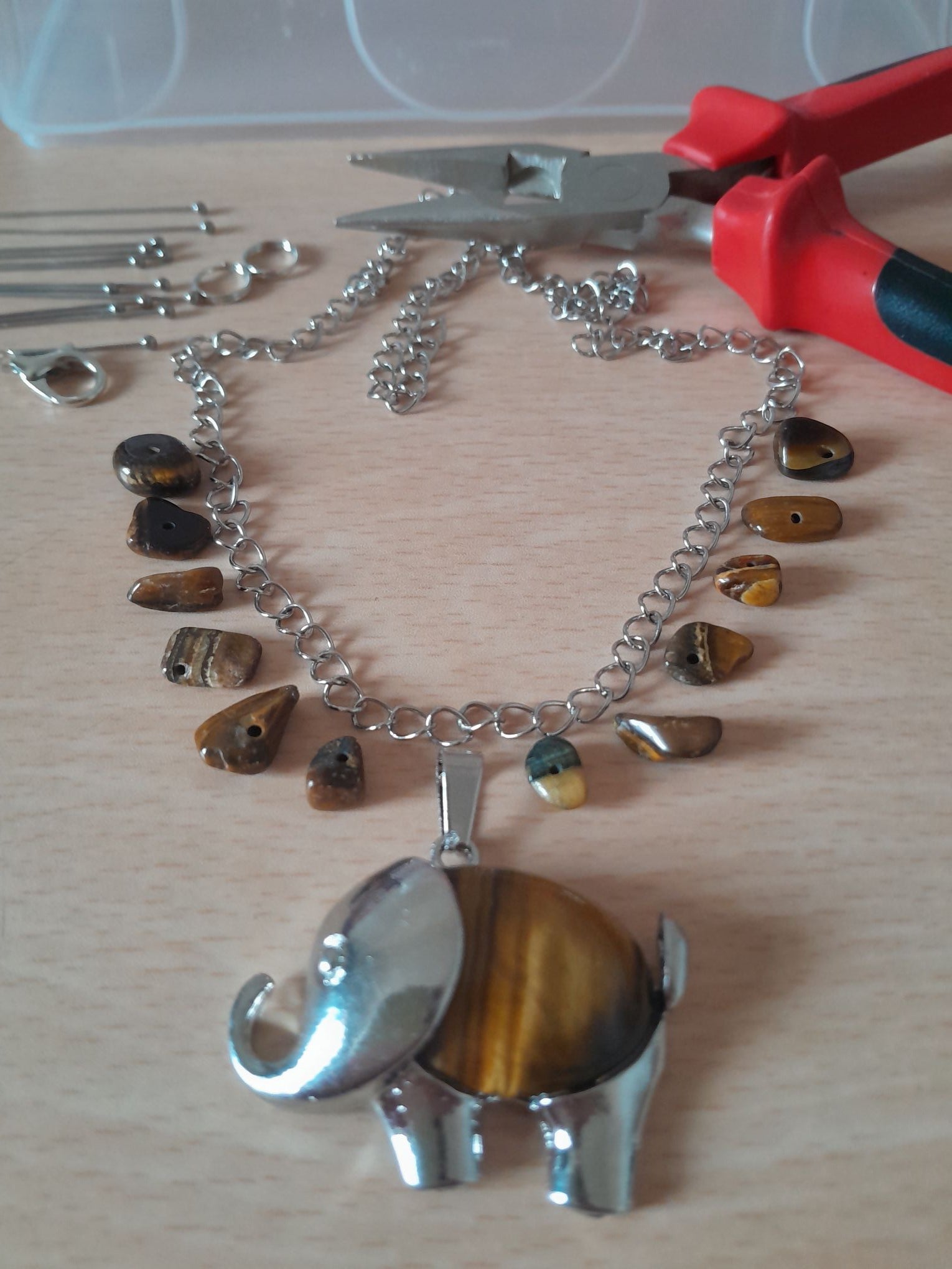 (Kit 1 to 4) Necklace pendant (elephant, lion or leopard), coloured beads, elastic, scissors, packaging re-usable plastic container