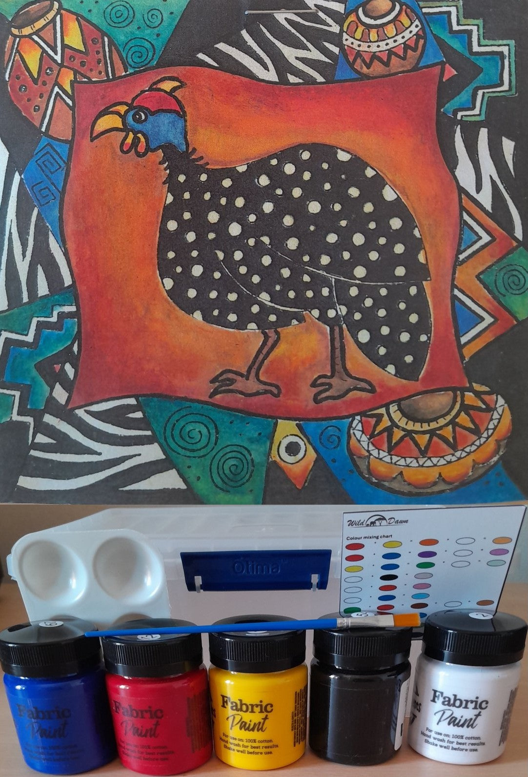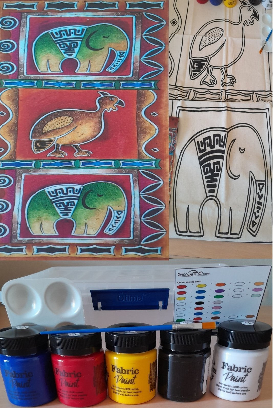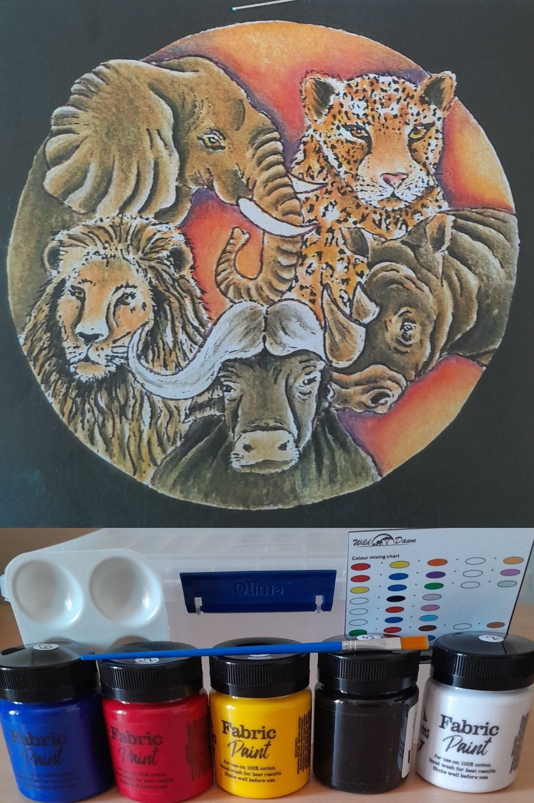 (kit 1 to 17) 5 colours of fabric paint (red, blue, yellow, black, white), paint palette, paintbrush, colour mixing guide, fabric painting instructions, packaging re-usable plastic container